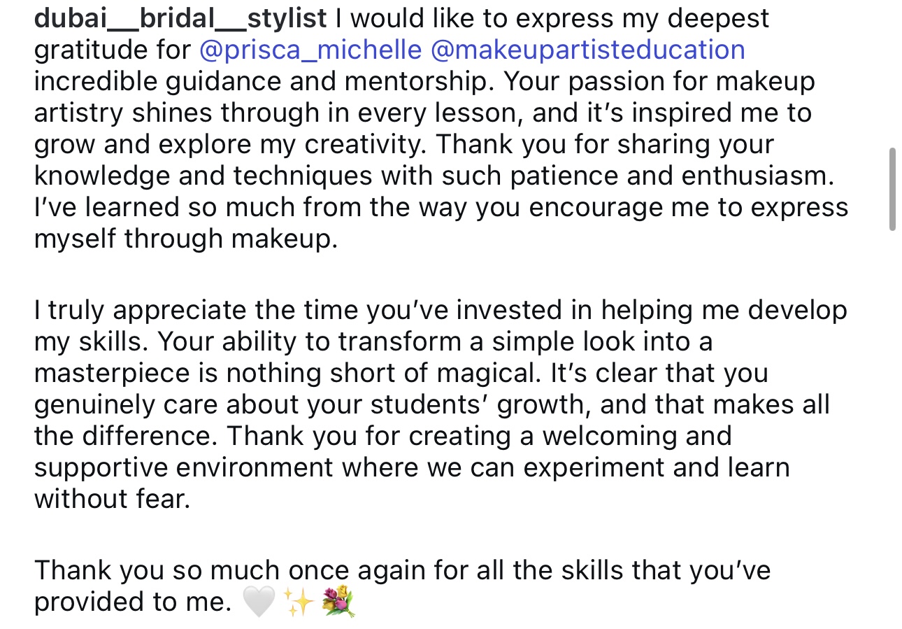 I offer a range of services, including Bridal and event makeup services, makeup artistry training, and content creation courses. Whether you’re looking to learn new techniques, improve your makeup skills, or create stunning beauty content, I have something for you.